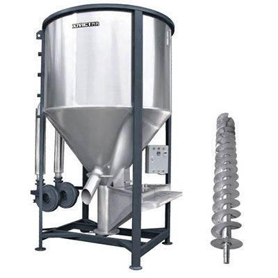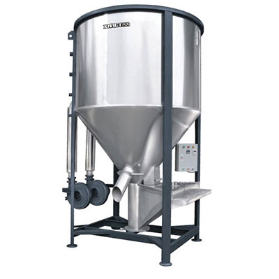 大型立式混料机,采用螺旋搅拌工作之原理,将投入投料斗中的物料通过螺旋主轴翰送到桶体上端,再以伞状形落下且一直持续循环搅拌,从而达到混合均匀的目的。